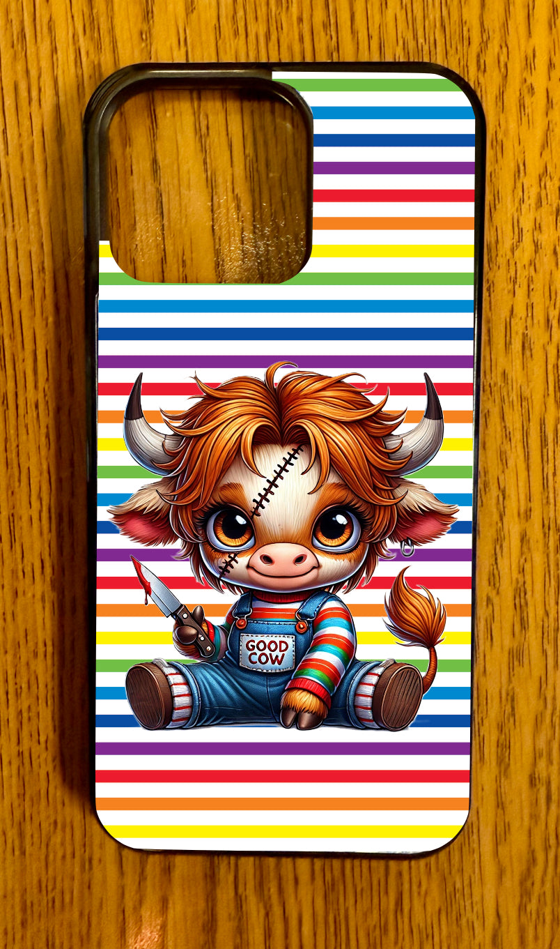 "Add a playful touch to your phone with our Trouble Moo phone case. Featuring a devilishly cute cow against a colorful striped background, this case combines style and protection for your device. Embrace the fun, playful spirit with every call and text."
